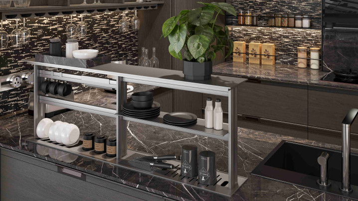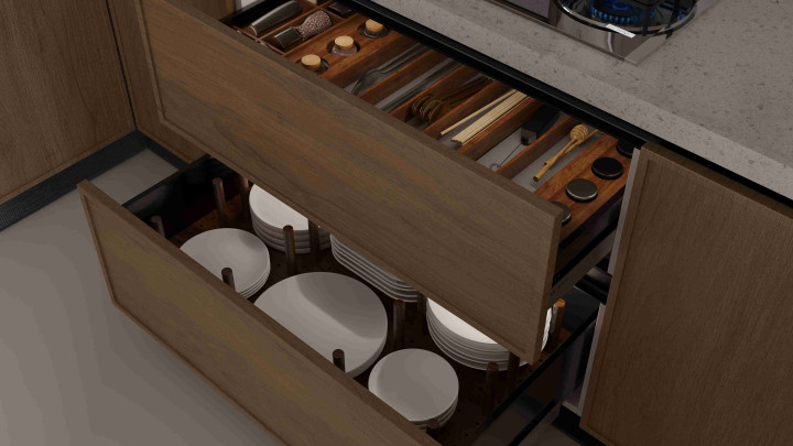 举个例子,一般人肘高约 900mm,那么高台面可以设为 750~800mm,低台面设为 650mm 左右,这样的高度差能让不同操作都更舒适。